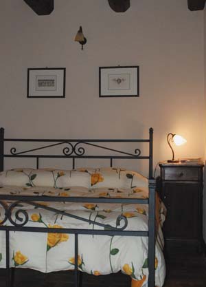 Camera matrimoniale in pietra con travi in legno a vista, bagno con doccia, piccola biblioteca. La camera dispone di biancheria da camera e da bagno compreso accapatoio e asciugacapelli.